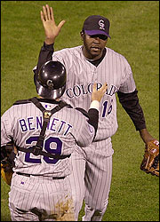 Jiménez, un relevista de cierre, encabeza a los Rockies con 82 salvamentos en su carrera, impuso una marca del equipo con 41 rescates la campaña pasada, y finalizó el 2002 con foja de 2-10 y 3,56 de promedio de carreras limpias admitidas.