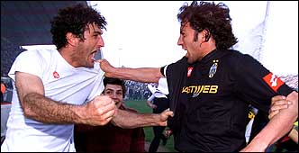 Ciro Ferrara y Alessandro Del Piero le dan rienda suelta a la alegría, después de que la Juventus se consagró campeón del Calcio, atropellando al Inter